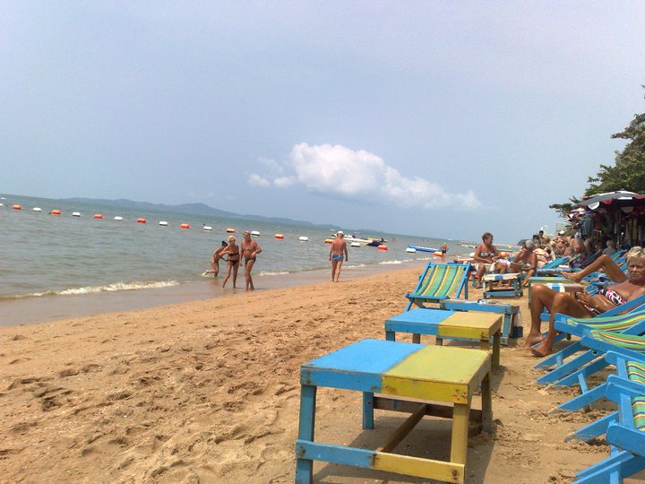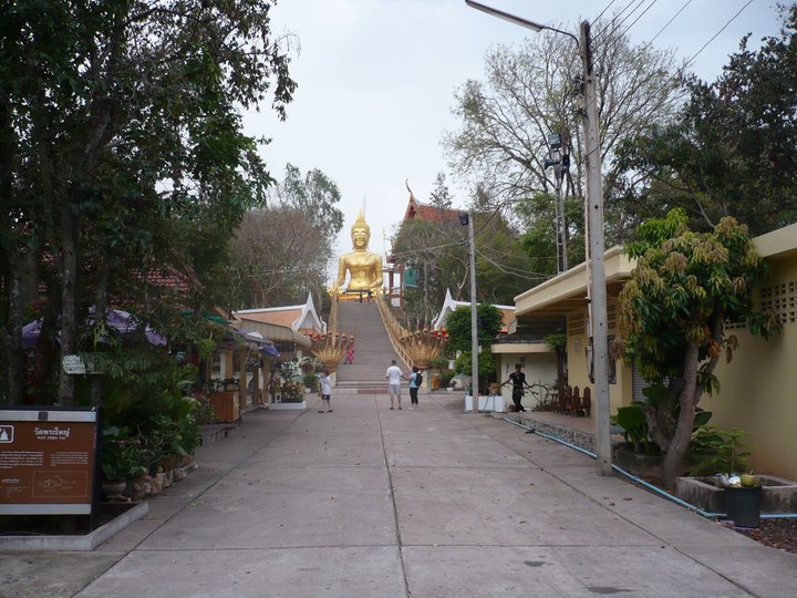 Ráno, za čerstva, jsme si asi díky mapě z recepce vybrali místo kam pojedeme na krátký výlet. Na hlavní silnici podél pláže jsme odchytili jeden z mnoha tuktuků. Tady byl oproti Bangkoku alespoň čtyřkolový. Ale pick up bez střechy, kde jsme si taky mohli plně užívat bláznivou jízdu s větrem ve vlasech. Lidi cestou naskakujou a vyskakujou jak se jim zlíbí. My pokynuli, vystoupili a zaplatili pár drobných na místě poblíž našeho cíle. Pár desítek metrů od silnice, po prašné cestě jsme došli až k areálu s klášterem. Dole pod dlouhými schody s ozdobným zábradlím jsme si hráli s budhistickými zvony. Já zaplatil kilo za vypuštění ptáčka z klece a vyslovení přání, které ten ptáček na tuty následně splní ("fakt myslíš že to splní??"-"no určitě jinak by za to lidi neplatili"). Pak už jsme vylezli ty dlouhé schody a stáli uprostřed nádvoří s menšími sochami, kterým vévodil obrovský pozlacený Budha. Hodinku jsme tak přebíhali a fotili tuto pro nás "velkou zvláštnost". Když jsme opět schody sešli, u prašné cesty už nikdo z turistů, co vystoupili s námi, nebyl. Nic moc ani nejezdilo. Řekli jsme tedy místním klukům, co seděli na vybudované dřevěné terase na stromě, jestli by nás nehodili zpět do města. Domluvili jsme se, byli v pohodě. Vysadili nás u ulice Walking Street, že tady se máme určitě porozhlédnout. Dlouhá ulice byla podobná Khaosan. I vzhledem i pověstí. Během zapadajícího slunce jsme si ji prošli celou až k molu. Zpět už v pološeru jsme začali chápat, proč ulice "hříšná". Bary ožily, neony ozařovaly veřejné domy, turisti se valili dosti veselí sem a tam. Začali nás oslovovat holky s nabídkama, bordel mámy s pozvánkama do klubu, krejčí,jež ti ušije oblek na míru,týpek, co ti dá podržet opičku atdatd. No moc jsme na to zatím připravení nebyli, zapluli jsme až do poslední hospody na začátku ulice. Uprostřed byl velký ring a zrovna exhibiční zápas v thaiboxu (prezentovaný jako zcela vážný - kdo se v tom nepohybuje lehce uvěří, že si fakt nakládají naplno). Tak jsme dali Changa nebo Singhu, mrkli na zápas a pak se dopravili na hotel.